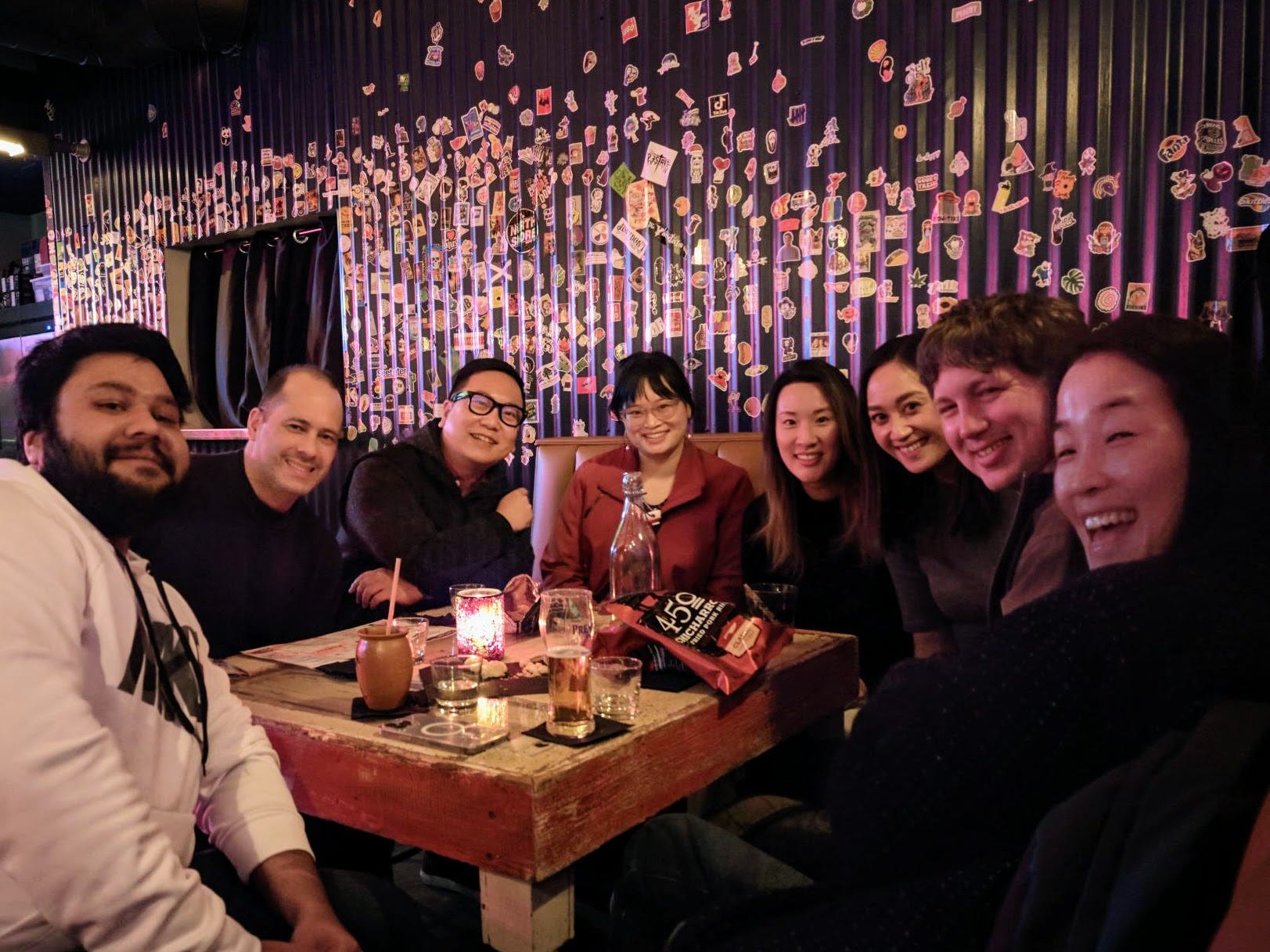 At a Happy Hour with my San Francisco coworkers. From left to right: Bhavik, Travis, Minh (actually a Seattle coworker), Angel, Ferdilyn, Chris, and Sookhee. Missing Amy and Scott.