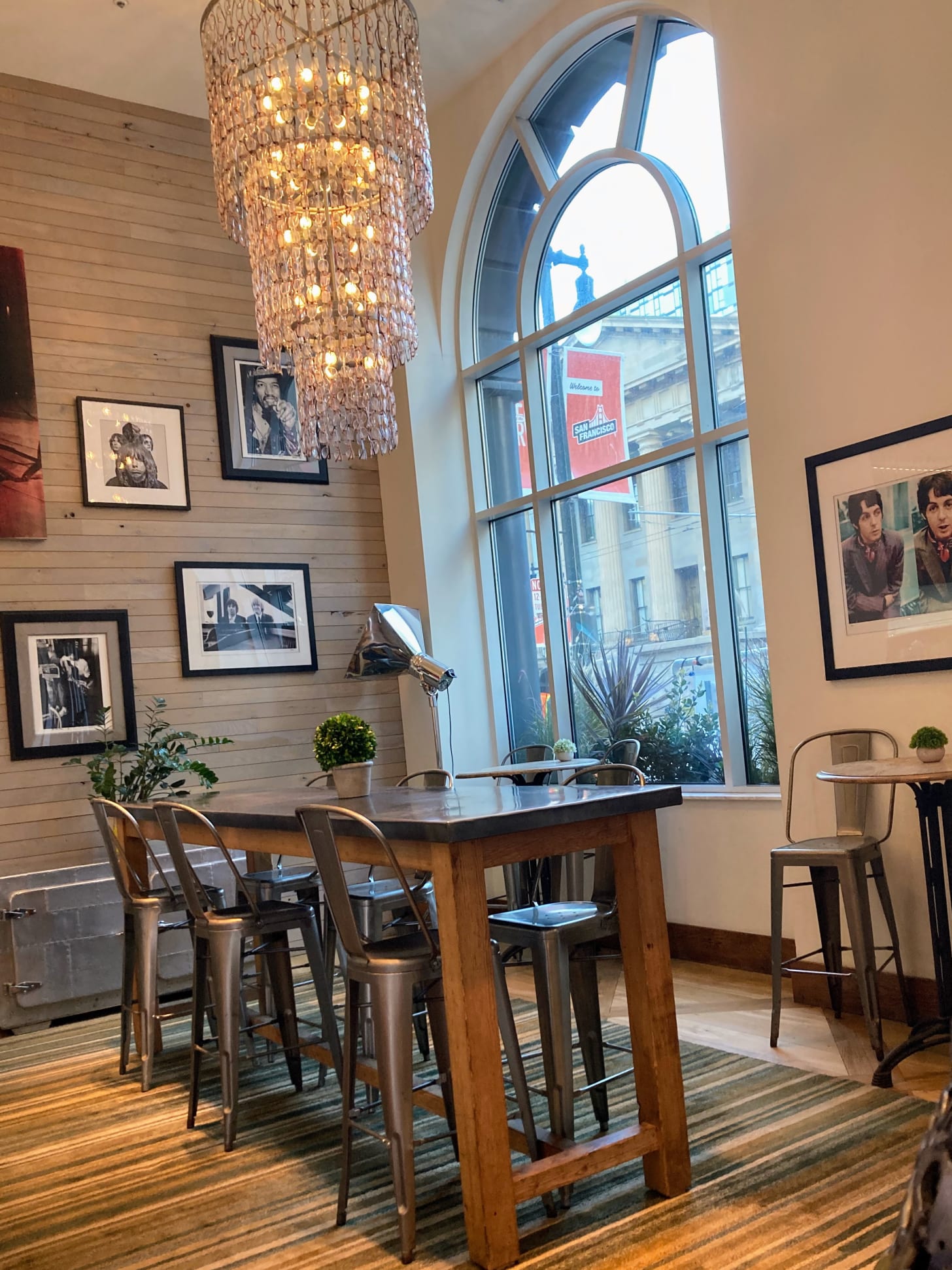The lobby of the hotel was designed by this interior designer from Seattle. She used some really cool lighting fixtures and sprinkled images of the Beatles throughout the space.